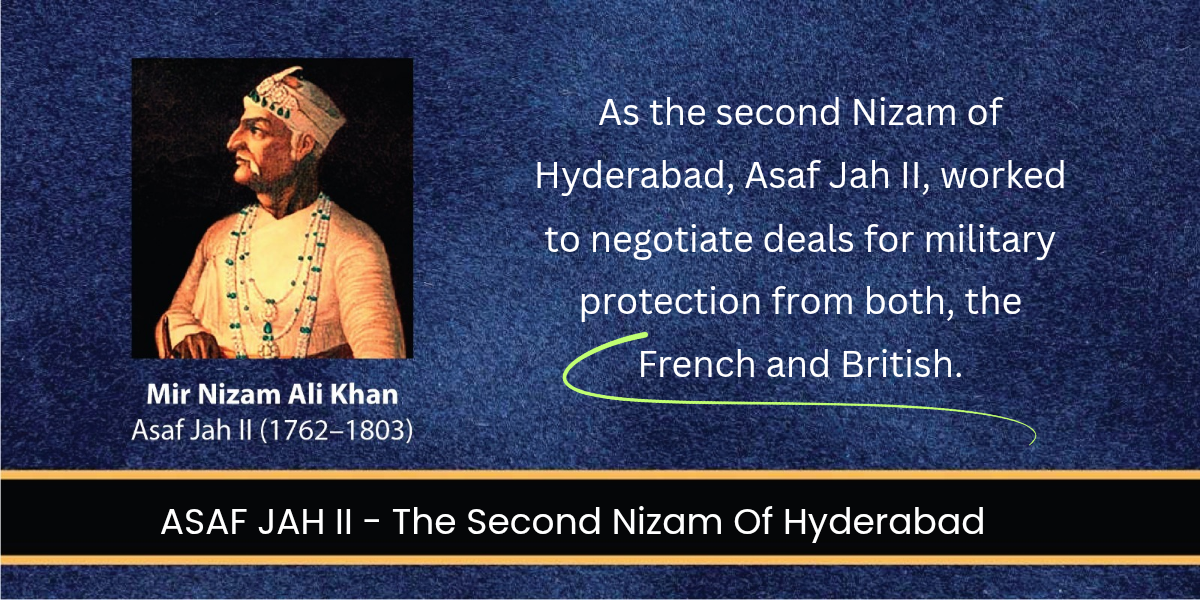 Asaf Jah II, also known as Nizam Ali Khan, was the second ruler of the Asaf Jahi dynasty of Hyderabad. He ruled from 1762 to 1803 and played a key role in shaping the political and military landscape of the Deccan during a time of intense rivalry between Indian powers and European colonial forces.